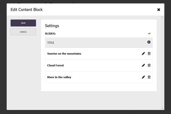 The carousel block type is now ready to use. When running the application and adding a new carousel block to a page, I can now add slides to the grid and edit, remove or re-order them.