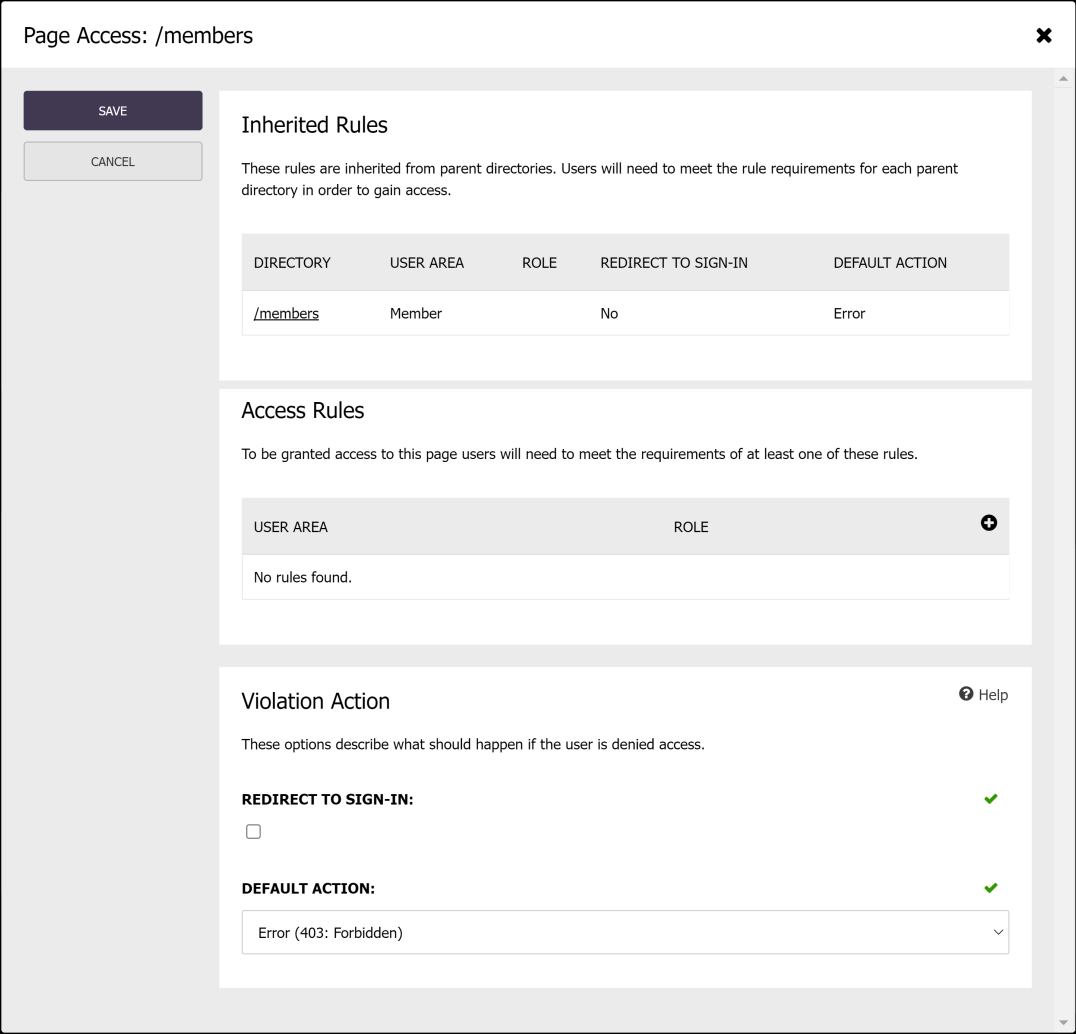 Once you have a user area, you'll probably want to secure some of your routes or CMS pages. We've added some additional authorization attributes for controlling access to routes, but one big new feature in this release is access control for CMS pages, which can now be configured in the admin panel by clicking on the Access Control button on an individual page or directory screen: